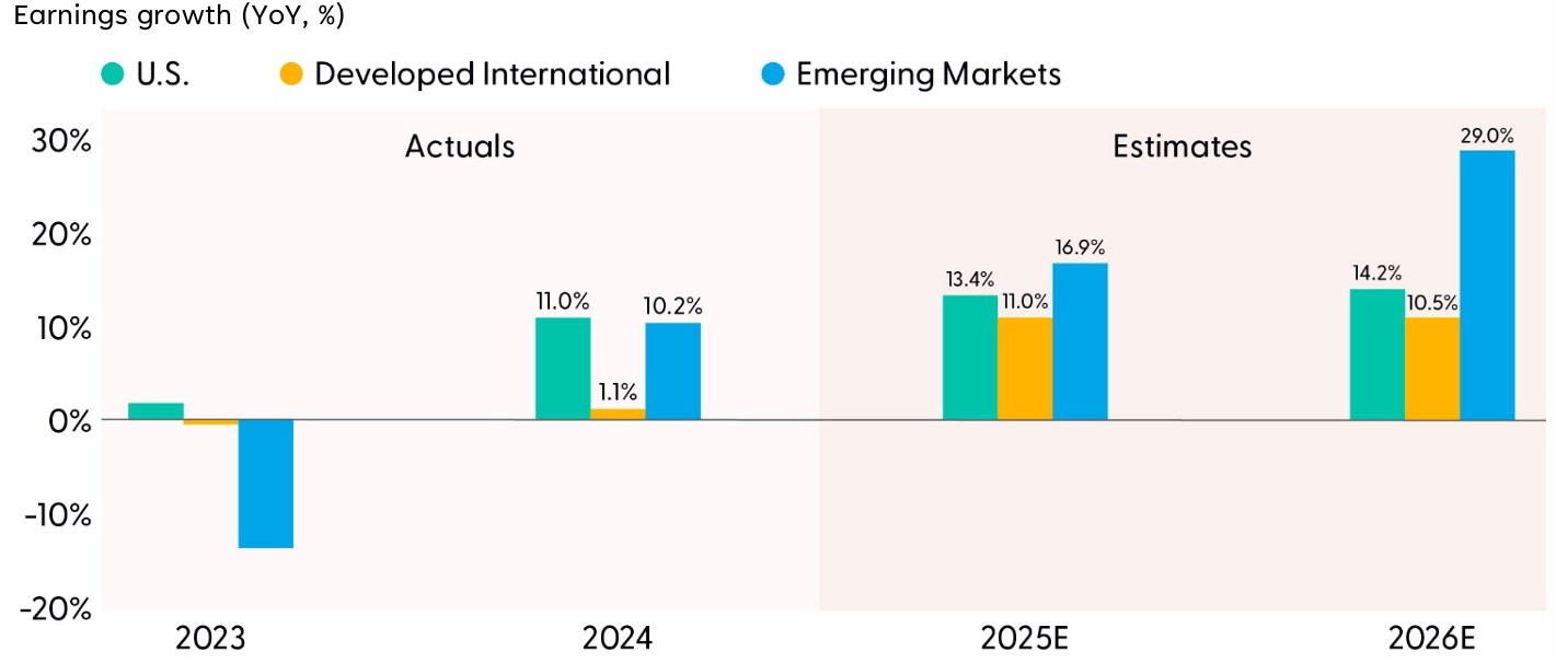 In 2026, EM earnings are expected to grow 29%, more than double current earnings growth expectations for the U.S. at 14%. EM may miss those lofty expectations, but the avalanche of AI investment in Asia and increased focus on corporate governance, efficient capital allocation, and shareholder returns, including in China, South Korea, and India, position EM earnings and cash flows to potentially outgrow the U.S. as well as Europe and Japan in 2026.
